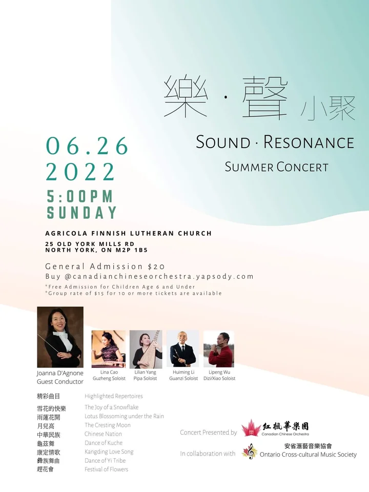 Sound Resonance Summer Concert 2022Presented by Canadian Chinese OrchestraIn collaboration with Ontario Cross-Cultural Music SocietySound Resonance Summer Concert poster